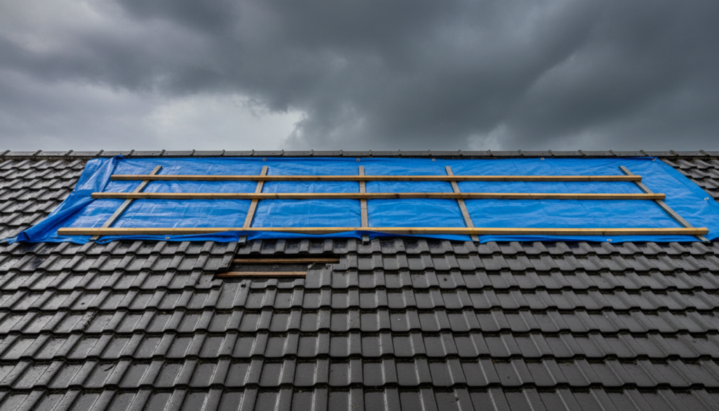 Temporary measures may include tarping exposed areas, securing loose tiles where safely accessible, and sealing minor openings from inside the loft space. However, climbing onto a storm-damaged roof without safety equipment is extremely dangerous and should be avoided.